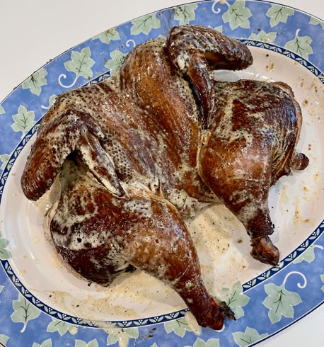 - Spatchcock the chicken. That means to remove the back bone with a pair of poultry shears. Then slice down both sides of the breastbone from the back about 1/2 inch deep. This technique will allow the chicken to lay flat which allows it to cook more evenly, presents better, and is easier to carve.